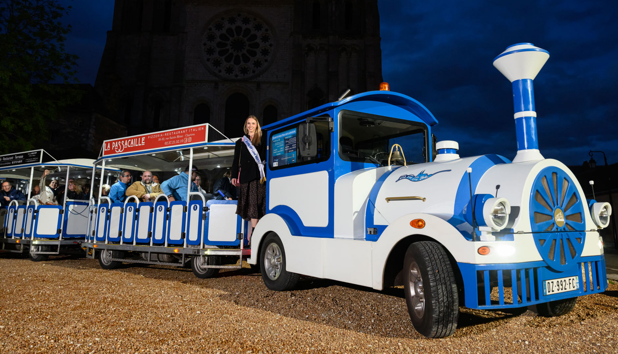 D'avril à janvier, il serpente le soir dans le centre-ville d'un site illuminé à l'autre tout en commentant les richesses et les mystères de la vieille ville de Chartres.